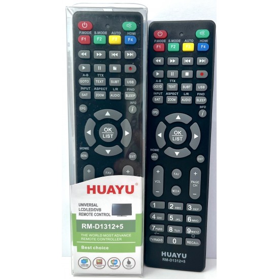 Huayu RM-D1312 – универсальный пульт дистанционного управления, который можете заменять более 200 пультов различных ДУ для DVB-Т2 тюнеров, телевизоров и спутниковых тюнеров. Выполнены из качественных материалов в небольшом корпусе, как и большинство пультов в таком корпусе. Такой пульт можно найти только под другим названием, а именно Huayu VP-001. Легко настраивается с помощью нескольких вариантов, что не составит вам большой сложности, его синхронизации с вашим T2 тюнером, телевизором или ресивером. Sat-Integral, StarSat, MAG, WinQuest, Oriel, EuroSat, Liberty, Mystery и многие другие – вот далеко не полный список производителей к тюнерам которых может подойти данный пульт ДУ.